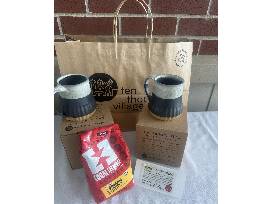 Fair trade coffee mugs (handcrafted in Nepal) and organic fair trade Colombian coffee with a $100 Ten Thousand Villages gift card.