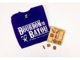 This Bourbon and the Bayou basket is a perfect blend of style and fun! It includes a purple size medium Bourbon and the Bayou t-shirt, perfect for showing off your event spirit. The basket also features a unique 6.5 x 6.5 in. wooden tic-tac-toe board, handcrafted by Trinkets N Treasure. Instead of traditional X's and O's, this one-of-a-kind game board showcases bourbon bottles and barrels, adding a playful touch to your game nights. A great combination of fashion and entertainment, this basket is a must-have for any bourbon enthusiast!