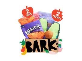 Get your dog's tail waggin' with 3 free Bark Boxes delivered to your home. Bark Box contains 2 original plush toys for snuggling, squeaking, and playing and 2 bags of healthy treats for your pup. Each month is a new theme so your doggo will have a good variety of snacks and toys!