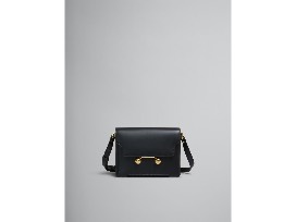 Beautiful Marni Trunkaroo (medium) shoulder bag from Sharis Palm Beach on Worth Avenue. It is crafted from calfskin leather and includes a front flap with magnetic gold hardware, engraved Marni lettering and oversized stud details. It is very versatile as it can be worn day to night and even as clutch! Made in Italy.