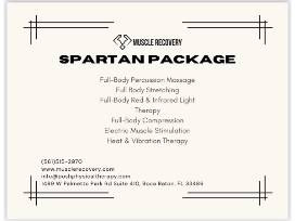 Muscles need special attention! Four sessions of the Spartan package which includes: full body percussion massage, stretch program, heat and vibration, infrared/red light therapy, vasopneumatic compression, and electric muscle stimulation (EMS). Boca Raton Location.
