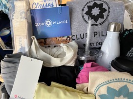 Join Club Pilates (West Delray) for 4 Reformer based group sessions ($180 value). You will be set from head to toe in Club Pilates accessories: duffle bag, tote bag, pilates loop, clear tumbler, stainless steel water bottle, portable ceramic tea cup, t- shirt (S) and grip socks (S). Also included: pair of gray Lululemon leggings (4), bike shorts (S), 2 tank tops (XS and S), and 2 t-shirts (S).