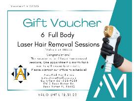 Enjoy 6 Full Body Laser Hair Removal Sessions with a Gift Voucher to AuraMed Aesthetics in Boca Raton. One appointment a month for 6 months will ensure best results! Painless, quick and easy!