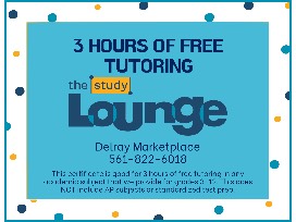 Does your student need a little extra help before a test? Your child will benefit from 3 x 1 hour tutoring sessions at The Study Lounge, conveniently located in the Delray Marketplace. Grades 3-12.