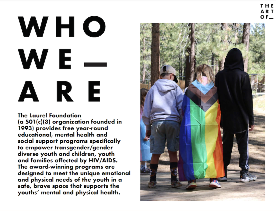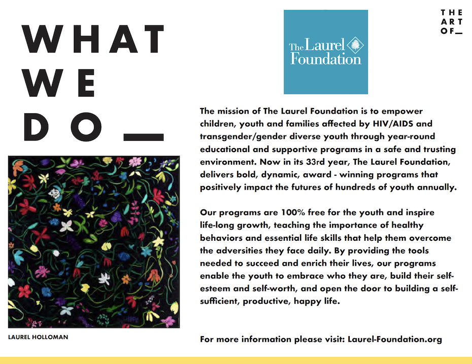 "THE ART OF_" is an online auction event supporting The Laurel Foundation's work to enrich and empower the lives of transgender/gender-divers youth and children, youth, and families affected by HIV/AIDS.