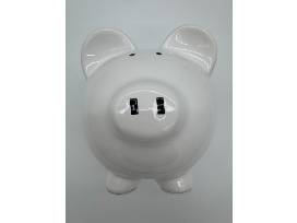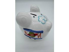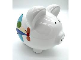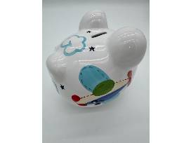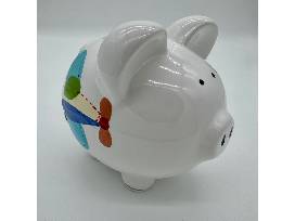 High quality dolomite ceramic piggy bank with hand painted airplanes and clouds, measures 8x7x7"