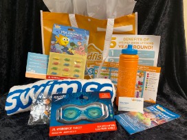 Water safety is so important! Enjoy this 3-Month Membership* + Annual Fee at Goldfish Swim School along with some amazing Goldfish Swim School swag in a clear waterproof backpack - including goggles, towel, water bottle, beach ball, chapstick, snack punch card, and Family Swim Pass (up to 6 uses)!