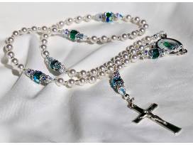 This gorgeous, handmade Emerald Green Swarovski Pearl Rosary is a lovely addition to your prayer life and devotion to God, or to gift for a special loved one. The serene Swarovski Pearls are flanked by beautiful Emerald green beads with gorgeous filament accents. Featuring AAA+ quality or above beads. Bella Donna Rosaries create exclusive, handmade, unique, artisanal, one-of-a-kind Catholic Rosaries.