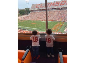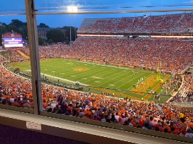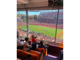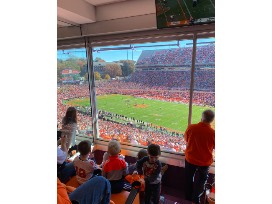 The North Suites inside Clemson's Death Valley allow you to experience the luxurious side of Clemson football. You will receive VIP parking privilege, access to the suite before and after the game, catering, theater-style padded seating and HD TVs. The suites also feature retractable windows. Get ready to experience the thrill of "the most exciting 25 seconds in college football" and join the crowd in cheering our Tigers to victory. Donated by Roger and Michele Bryant.