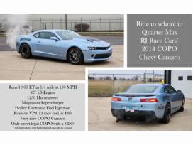Want to be the coolest kid on the block? Here's your chance! Bid for a ride to school or work in a barely street-legal RJ Race Car-and yes, it's as thrilling as it sounds! Hold on tight as you zoom in a 2014 Quarter Max COPO Chevy Camaro, a powerful machine that will turn heads wherever you go.
