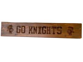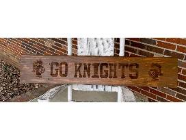Own a piece of our cherished history! This original wooden bleacher board from Sullivan Gym has been beautifully stained and preserved and engraved with "Go Knights'. It is a tangible connection to the countless memories shared within our beloved Sullivan Gym.