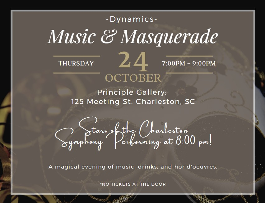 Join us for an enchanting evening at "Music & Masquerades" on October 24th from 7 PM to 9 PM at the Principale Gallery, located at 125 Meeting Street. Get ready to immerse yourself in a night filled with music, drinks, and Hor d'oeuvres.