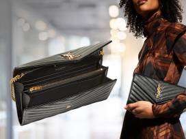 Elegant and practical, this compact chain purse features iconic chevron quilting, a Cassandre embellishment, and gold-toned brass hardware. Made from chrome- and metal-free tanned leather, it has a snap button closure, six card slots, and a zippered compartment. Wear it as a clutch or on the shoulder with the detachable chain.