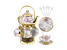 Etiquette is reimagined with Fascinators & Tea, and teatime with your family and friends can be reimagined with this 20-piece porcelain tea set. The teapot, teacups, saucers, and spoons are decorated with an elegant floral design and organized in a beautiful two-tier stand. Serves six.
