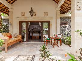 Your private cottage with a king-size bed and enchanting indoor/outdoor shower is surrounded by the resort's lush gardens and high-end amenities.