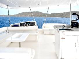 Each air-conditioned queen stateroom has its own bathroom and standup shower. With six lounging areas, the boat has ample space to spread out to relax, unwind or party in style. The massive flybridge has a sundeck, wet bar, refrigerator, ice maker and electric grill. The aft deck is home to sleepy-eyed breakfasts following late-night, wine-fueled dinners.