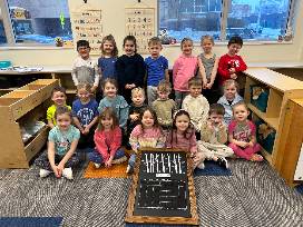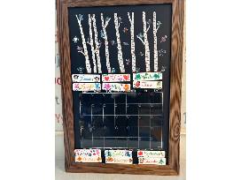 This year the 4-5 preschoolers made a perpetual chalkboard calendar. Each child chose their favorite color to use for their fingerprint that was turned into a bird on the chalkboard. Students also used their fingerprints to create seasonal items for the magnetic monthly tags. The calendar portion can be removed to allow the board to be used as just a chalkboard.