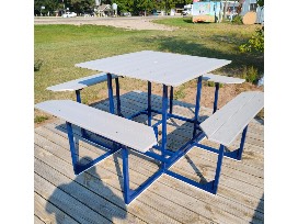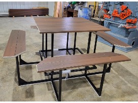 This maintenance free table would be a great addition to our outdoor space at your lake or home! It is a 4 foot x 4 foot custom high top picnic table (37 inches high) that comfortably seats 8 people. The powder coated frame is available inmost colors. Thank you, Ted & Laurie Petersen!