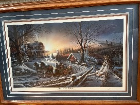 Terry Redlin's "Pleasures of Home" would be a great addition to your home. In this peaceful scene the children excitedly point out the mallards flying low overhead. The proud Belgians, the warmly bundled family, the crisp country air and the fading sun all convey the essential meaning of "pleasures of winter." We are reminded of a more innocent time when the countryside was at peace with itself and traditional family values reigned. Certificate of authenticity on the back. Framed and matted, 33 in x 33 in. Thank you, Randy and Doris Vigen!