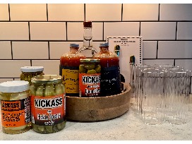 All your essentials for a great Bloody Mary- two variety of mixes, Tito's vodka, and a large variety of fixings! We have also included a black and white checkered decorative bowl, six high ball glasses, ice scoop and ice tongs. Thank you Brett & Jeanette Summerville!