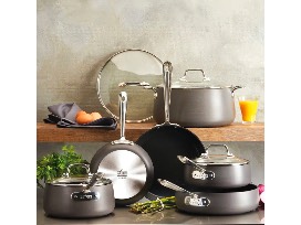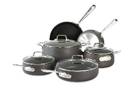 This All-Clad HA1 Hard Anodized Nonstick cookware set includes 8 and 10 inch Fry Pans, 2.5 quart and 3.5 quart covered Sauce Pans, 4 quart covered saute pan, and 8 quart covered stockpot. HA1 Nonstick heavy gauge aluminum and stainless-steel base deliver even heat for consistent, delicious cooking. The high-quality PTFE nonstick brings a long-lasting and easy release when cooking. Oven safe up to 500 degrees and compatible with any stovetop, including induction. Glass lids are oven safe up to 350 degrees and dishwasher safe. Thank you, Jennifer Conzemius!