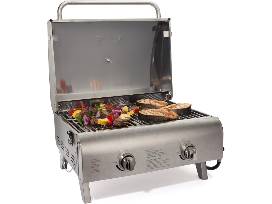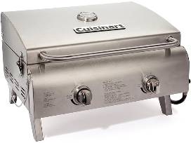 Cuisinart's chef style tabletop, portable gas grill with dual burners. This stainless steel grill is perfect for tailgating, beach picnics, camping, backyard BBQ's and so much more! Measures 17"D x 21.5"W x 26"H. Designed for use with a 20 lb propane tank, not included.