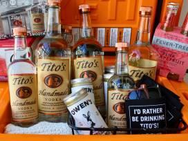The package includes a Tito's Yeti Tundra 35 in brand new King Crab Orange. Includes an assorted amount of Tito's bottles with bigger bottles for the party, tailgate, or bonfire.