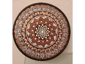 Mandala design in copper and white using a dot painting technique on acadia wood. 12" diameter. made4ucreations.com