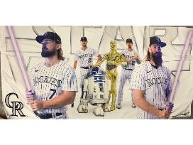 This summer-classic package includes two tickets to the Colorado Rockies' Fireworks Game on July 5, 2025. Club Level Tickets - Section 242. You also get a Rockies tote, black ball cap with attached wig, Rockies Star Wars beach towel, a Camo ball cap, Rockies 100 anniversary inaugural pennant, Cuddyer jersey (size XL), t-shirt (size XL), beanie, and tumbler. Go Rockies!