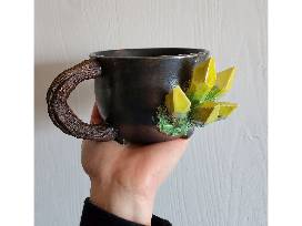 Package includes metallic black cauldron mug by Essarai Ceramics with sculpted wooden handle and yellow/green crystals. Paired with a bottle of 2023 Monte Volpe Pinot Grigio and handmade pair of body-shaped candles with brushed gold accents.