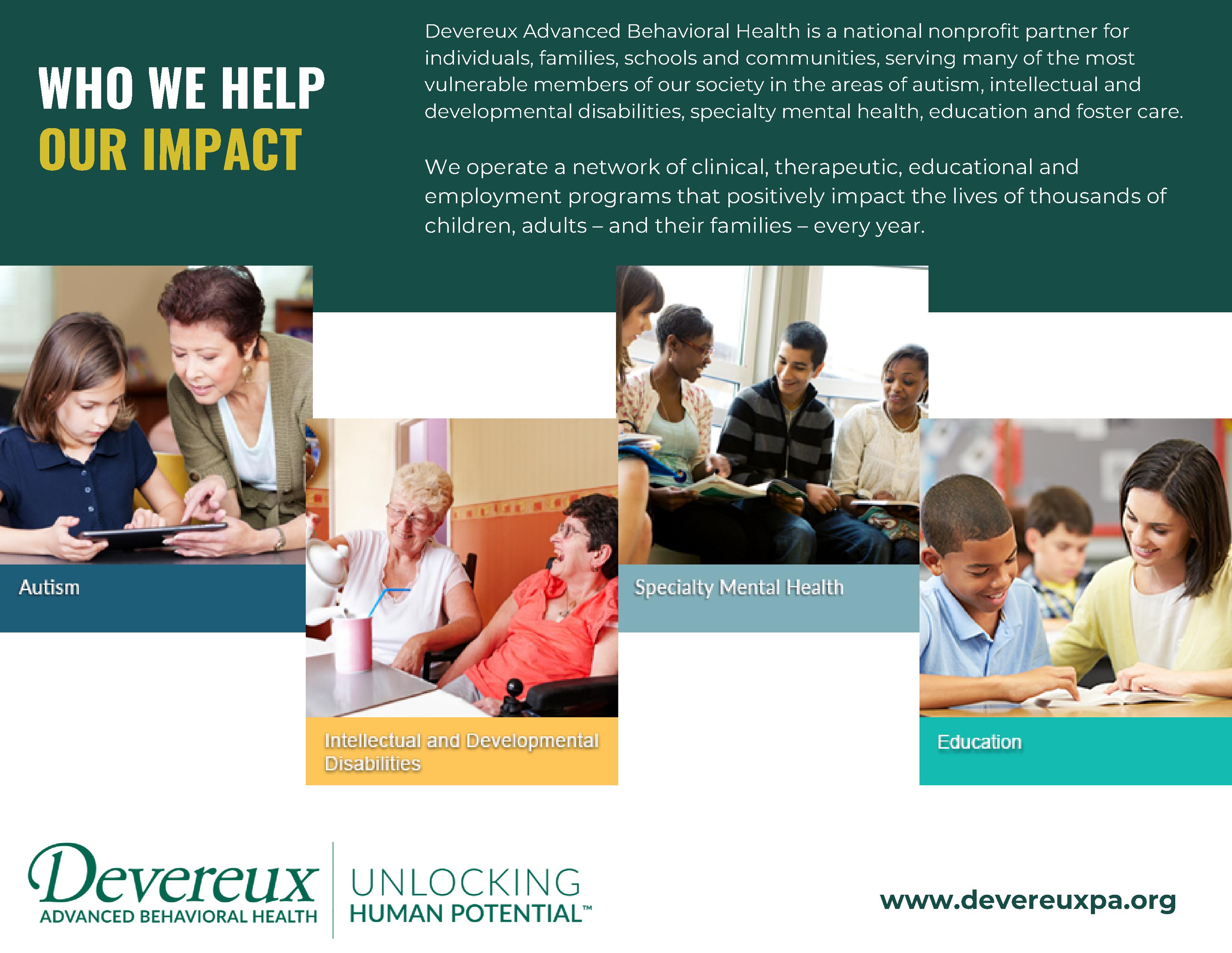 Your generosity will directly impact the children, adolescents, and adults with emotional, behavioral, and cognitive differences served in Devereux PA programs. With your help, we can continue to offer the best in specialized treatment and innovative services for people of all ages. Together, we will make a difference.