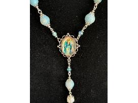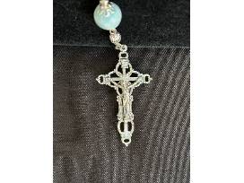 Hand made, one decade chaplet features Mother of Pearl master beads, Blue Swarovski crystals & Blue Larimar quartz.
