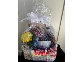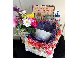 This package also includes a floral kitchen towel, Pioneer Woman salad dressing squeeze bottle, white glass bowl, hot bowl coozies and a floral bouquet in a tin.