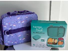 Go to lunch with function and style! Check out these two Bentgo lunchboxes. The first is a unicorn pattern lunchbox that has a water bottle holder on the side and a large strap to help you carry your lunch. The softer sides are wipeable. The second is a hard case leak-proof lunchbox with 3 compartments. Can hold up to almost 5 cups. It has a Dishwasher Safe tray and Microwave Safe tray