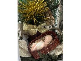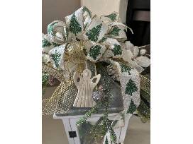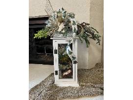 White Christmas Lantern garnished with greenery. The arrangement includes angel and baby Jesus figurines.