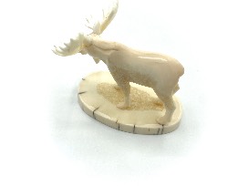 The Ivory Moose Figurine is 2'' long, 1.5" wide, 2.25" height donated by Athabascan Artist Leonard Savage. Leonard Savage is from Holy Cross, AK.