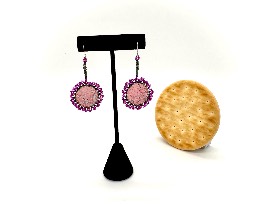 These Round Dyed Fish Skin Earrings are made with purple and black beaded edging and pink fish skin. These earrings are made by Inupiaq artist Nina Thompson. Nina Thompson's business name is Sew Sanatu.