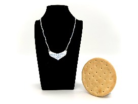 - The blue and white Alutiiq Markings Necklace features copper enamel and opaque to light blue seed beads donated by Sugpiaq Artist Pilista Jessica Towns-Camara. Jessica Pilista Towns-Camara, a talented artist of Sugpiaq/Alutiiq, Yup'ik, and Scotch-Irish heritage, utilizes the power of jewelry to forge deep connections with her ancestral Sugpiaq homeland in Alaska, specifically the Native Village of Pilot Point. Based in Renton, Washington, Jessica's work reverberates with the strength and resilient spirit displayed by her Alutiiq ancestors. Drawing inspiration from her heritage, Jessica honors the remarkable qualities of her forebears by incorporating carefully chosen materials and designs into her jewelry. Each piece she creates carries the essence of her journey as an artist, intertwining her personal growth with the rich tapestry of her cultural heritage. She skillfully employs unique shapes and materials that serve as visual narratives, reflecting her artistic evolution.