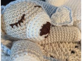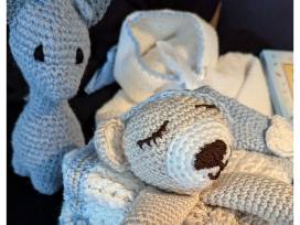 Hand crocheted blanket, hoodie with tassel, and booties will be perfect for a cuddle. The giraffe and "Tired Tucked in Teddy" will become favorites!