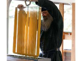 Beeswax collected from honeycomb is formed into large, 40-pound bricks by the beekeeper. For candlemaking, these bricks are melted in a large, 50 gallon double-boiler vat. Frames are strung with natural, all-cotton wicking of the appropriate thickness. The monk then takes these frames one-by-one and slowly dips them into the vat of molten wax. Layer upon layer is added to the candles in each successive dipping until they reach the desired thickness. While still warm, the candles are cut out of the frame with a sharp knife. The wicks are trimmed and base is chopped square. The finished candles are carefully packaged for shipping.