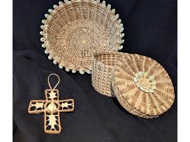 Ringed with cowrie shells, these vintage Marshall Islands woven round basket, covered basket, and cross are all beautiful and will make a wonderful addition to your home.