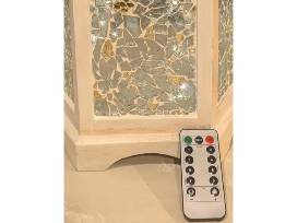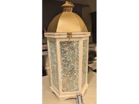 Taking a vintage lantern and turning it into a one-of-a-kind piece, glass artisan Diana Sherrod has adding a mosaic of small pieces of clear glass, with accents of gold, allows all 6 sides to catch and reflect the light. Diana signed and added lights as well that can be controlled by the small remote, from solid light, to twinkling, to slow dimming and back. The glaze gives the columns a vintage look.