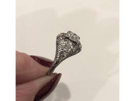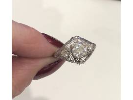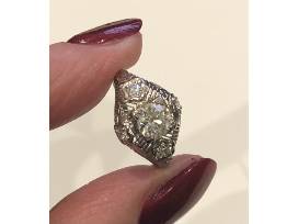1This antique ring set in platinum with approx. .87 carat Old European Cut diamond, ( SI 2, J,) (typical for the era); and 4 transition cut diamonds approximately .30 carat total weight (VS - SI) set in floral patterns near center stone; a leaf pattern drapes down the sides;