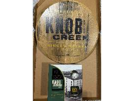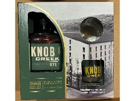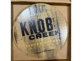 Enjoy a Knob Creek round wooden sign with 750ml Knob Creek Rye bottle and 2 signature whiskey glasses.