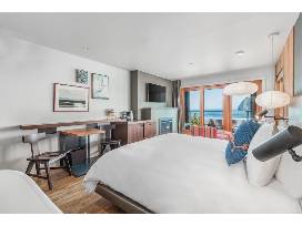 Room includes a private oceanfront-facing balcony, custom bike and surfboard racks, gas fireplace, beverage cooler, Bluetooth lantern speaker and Bonavita brewing system and freshly ground Flag & Wire coffee.