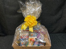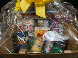 Gift basket with jerky, huckleberry pretzels, mustard, jam, coffee, seasoned butter, freeze dried berries, etc.
