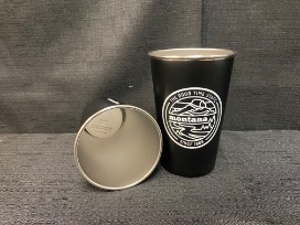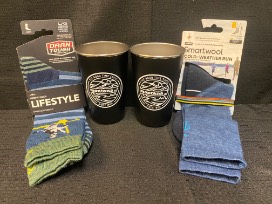 2 pair of men's merino wool socks and 2 stainless steel pint cups.