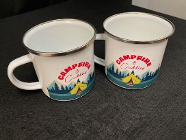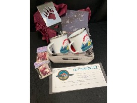 Basket includes: $25 gift certificate, set of metal camping coffee mugs, bear claw design extendable spatula, book "Campfire Stories: Tales from America's National Parks", and two packages of huckleberry bark.