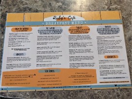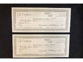 Enjoy a delicious meal at Ruby's Cafe with these two $25 gift certificates. Ruby's Cafe is a classic American diner that serves breakfast and lunch. We are well known for our fresh made biscuits to our chicken fried steak. We even have liver and onions on our menu. Home cooking at it's best.