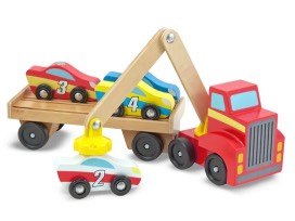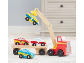 Includes red truck with magnetic arm, car-carrier trailer, and 4 magnetic wooden cars.